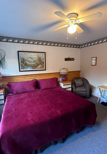 (Up to 2 children ages 15 and under may stay free with 2 parents in the same room) Room #1 has 1 king bed and a roll-away cot, Room #2 has 1 king bed and one single bed. Rooms #3 and #4 have 2 double beds each. All rooms have a 4 piece bath. Full family-style meals will be served to all guests in the great room with fireplace. Packed lunches will be provided as requested for day trips & there is help-yourself coffee/tea/fridge available 24/7.